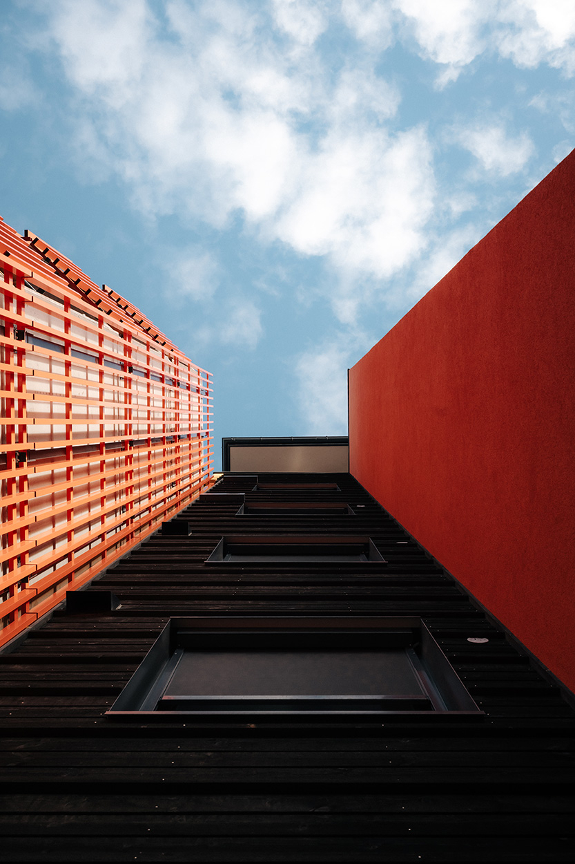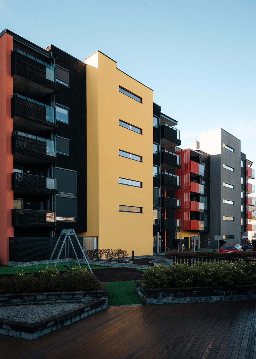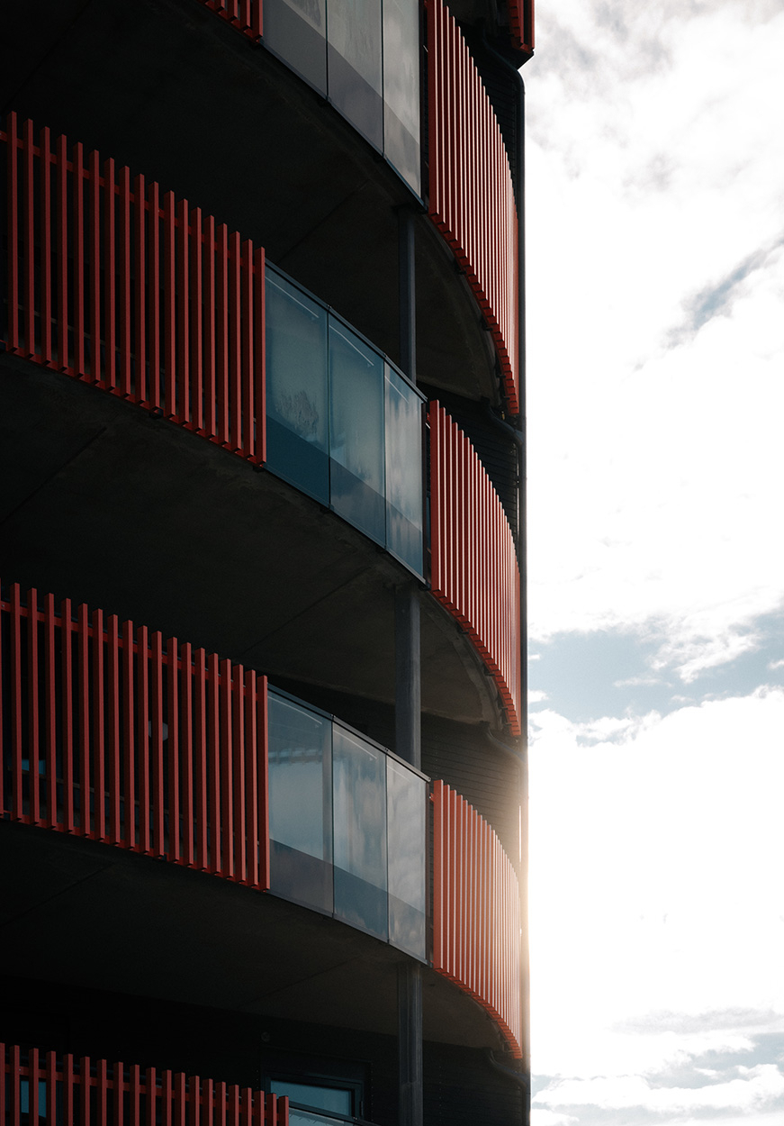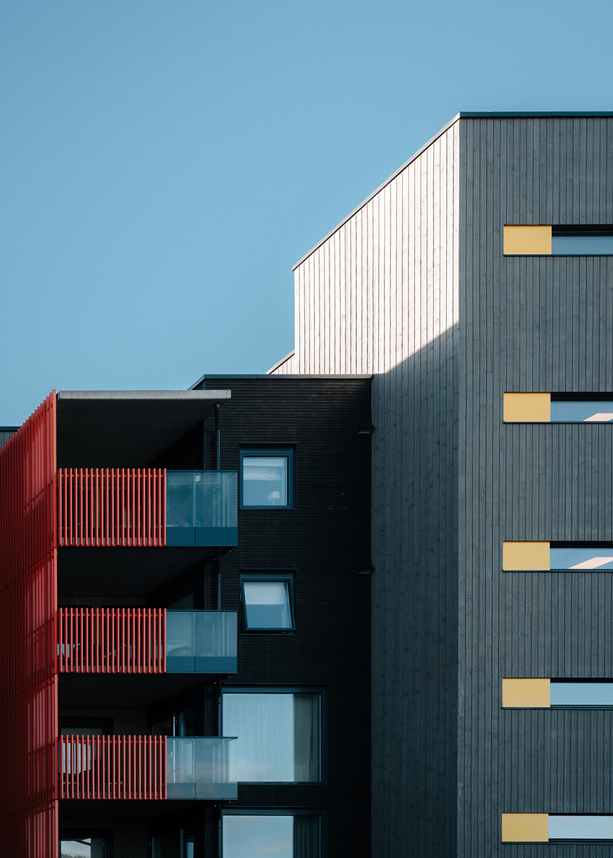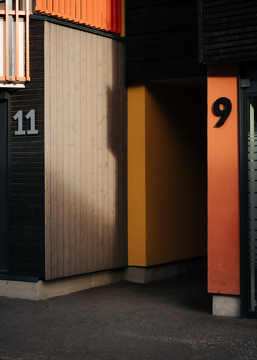 Balkonger har rekkverk med stående lakkerte spiler, som tar opp hovedfarge fra nabobygg S9.