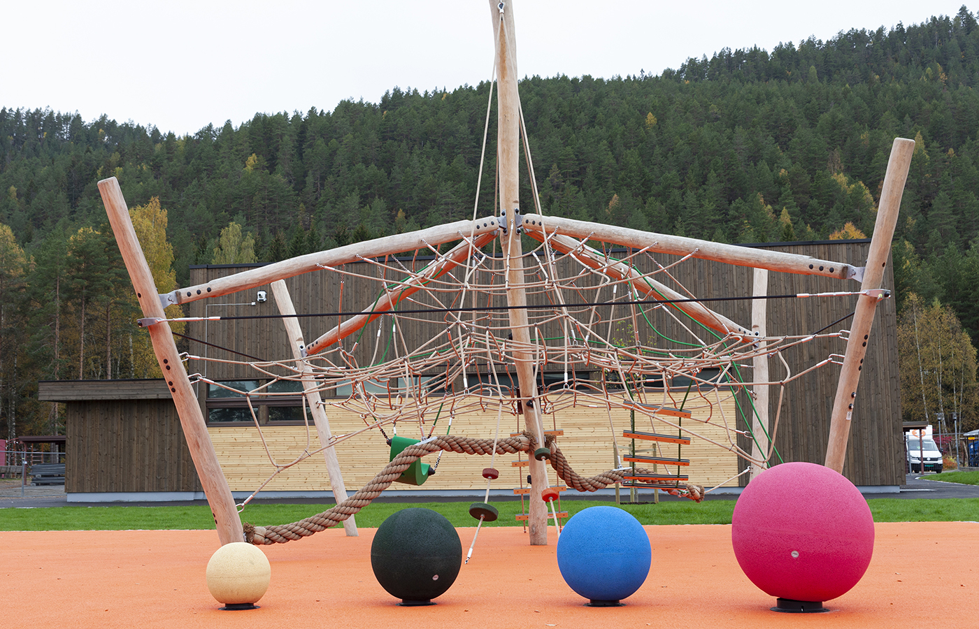 Nær elevinngangene ligger et stort lekeareal som er delt inn i to soner med alderstilpassende lekeapparater.