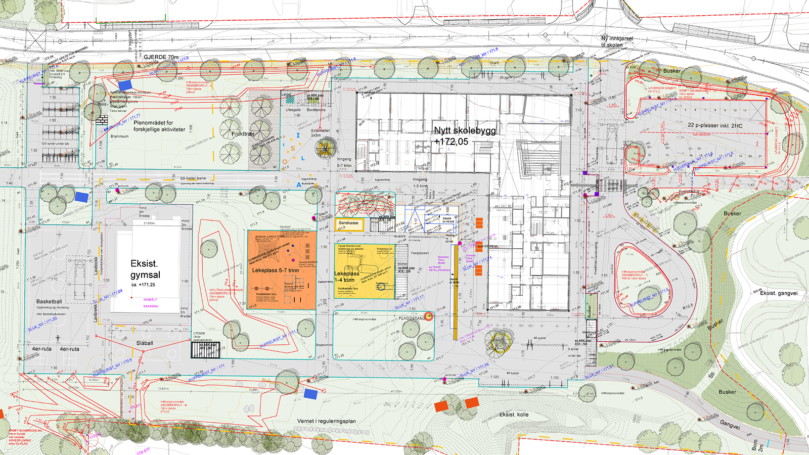Prosjektet omfatter detaljprosjektering av nytt skolebygg i henhold til utarbeidet forprosjekt fra L2 arkitekter. Vi har bistått med prosjektering, oppfølging og FDV-dokumentasjon innenfor fagområdene ansvarlig søker, arkitekturprosjektering, veg-, utearealer og landskapsutforming, samt interiørarkitekturprosjektering.